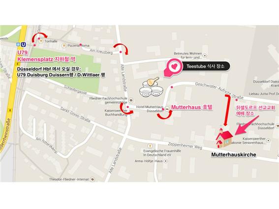 교회 주소 : Alte-Land Str. 179 40489, Duesseldorf 손교훈 목사 전화 : +49-02131-5249 186 (사택) +49-0176-5779 1004(핸드폰) E-mail : sohnmoa@hanmail.net U Bahn을 이용하실 경우에는 Klemensplatz 역에 내리세요.